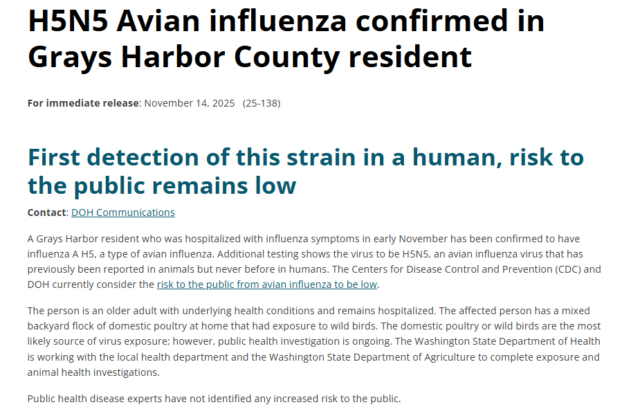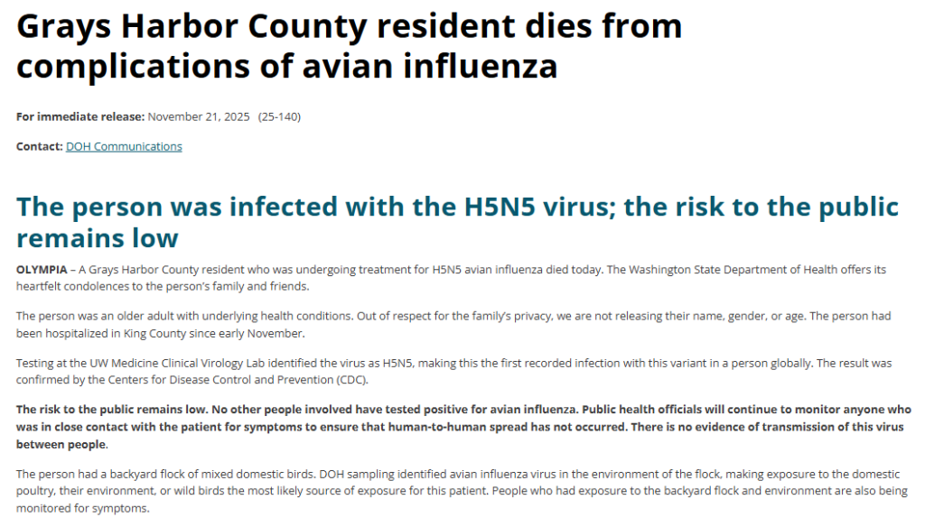 The state department of health previously reported a novel H5N5 infection in a resident on November 13, 2025. We still don’t know much about this person other than they were an “older adult” with “underlying health conditions conditions” who was hospitalized “with influenza symptoms” earlier this month.