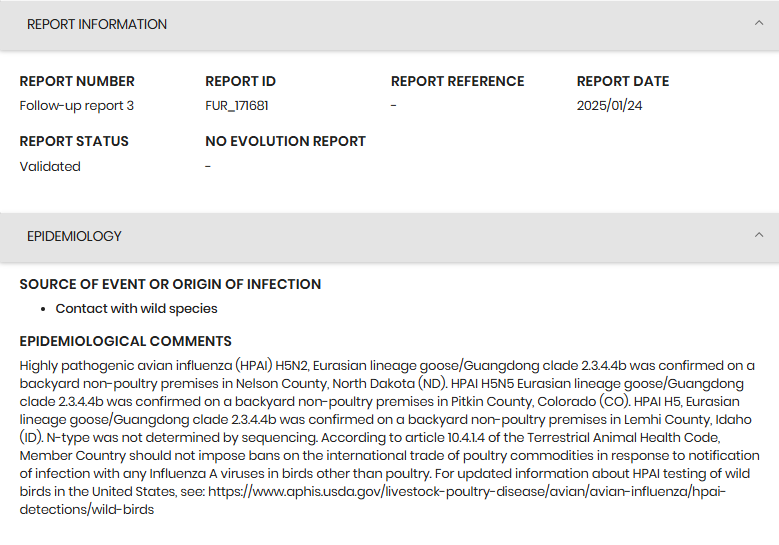 What strikes me is why now? H5N5 has been documented in migratory birds but this is the first spillover into a human. Even reports in backyard flocks were scarce, although they did happen. Indeed, this past January various H5 virus strains were found in domestic flocks in the United States, including H5N5. As noted on the legendary WAHIS dashboard, H5N5 bird flu was noted in a Colorado flock:
